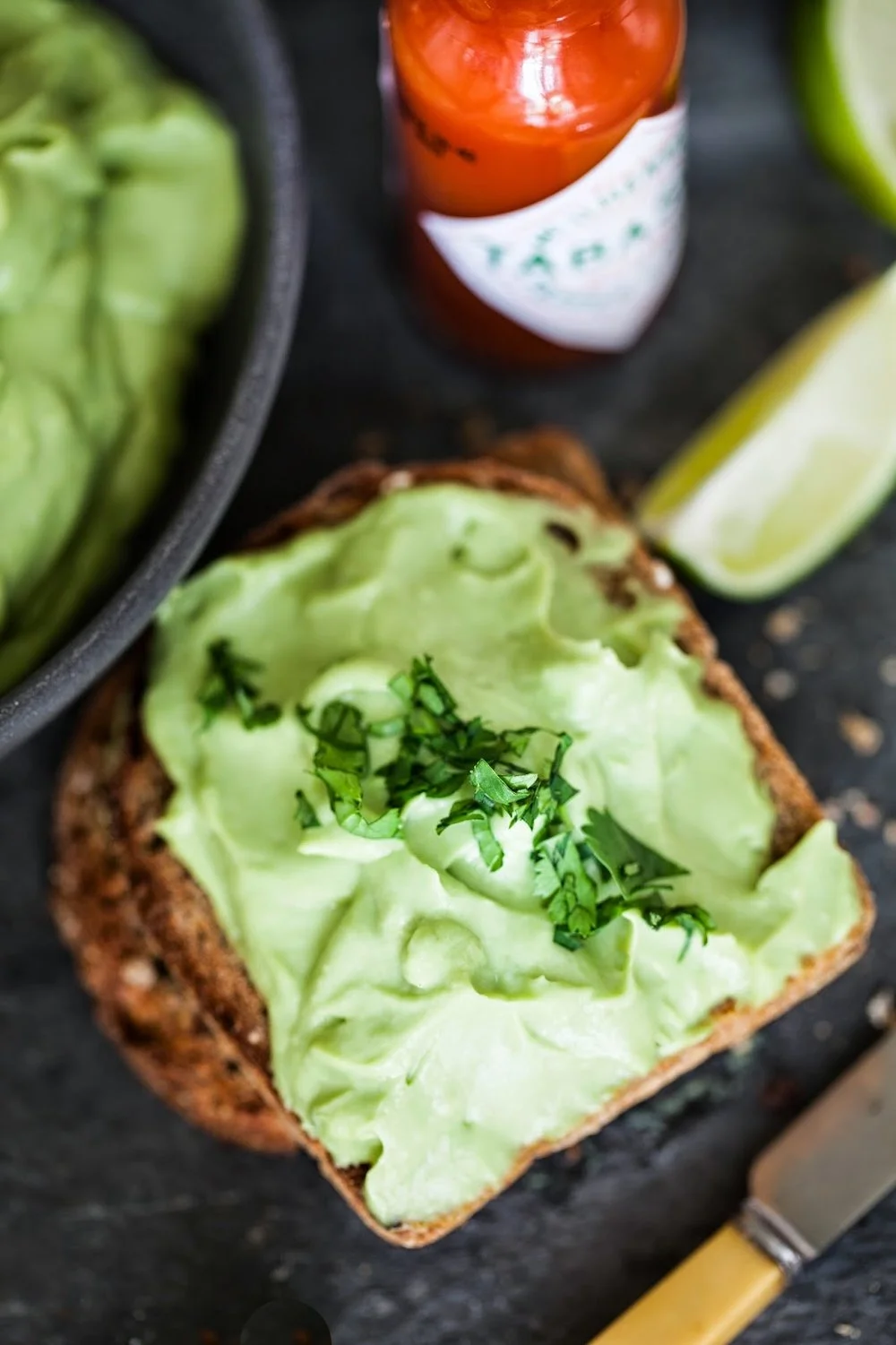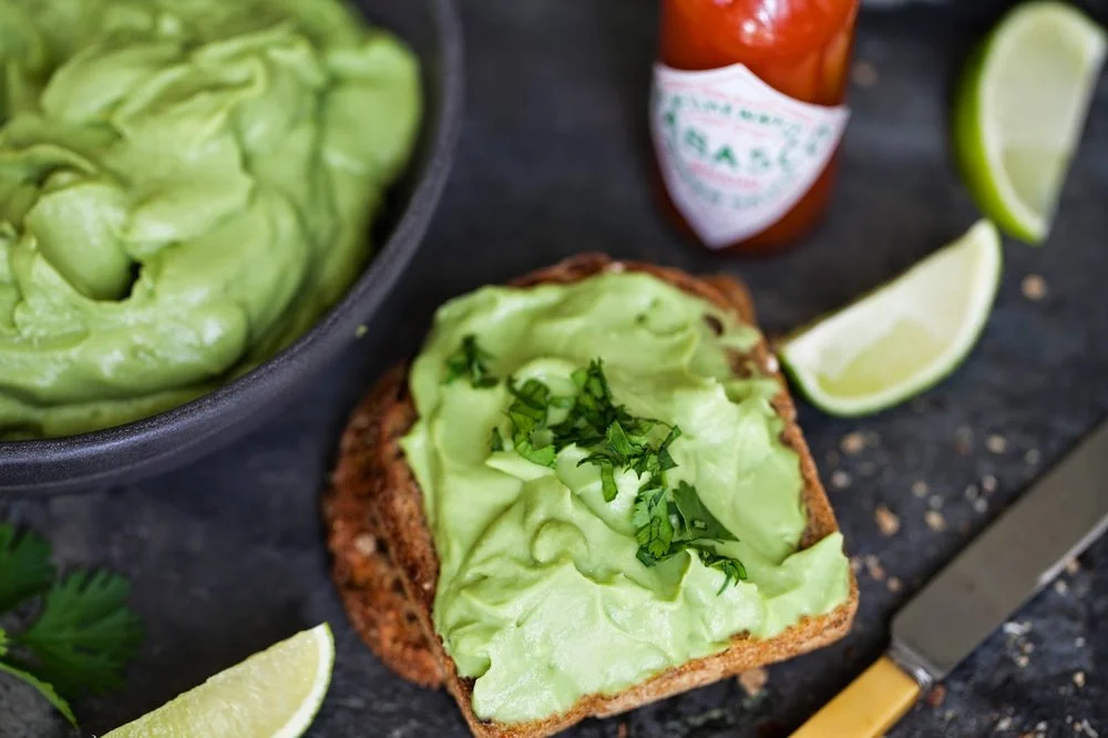 Halve the avocados, remove the stones and scrape the flesh from the skin. Place the avocado flesh into a bowl, add the lime juice and chopped coriander and stir well. Season with salt and pepper and add a few drops of Tabasco sauce to add a little heat to the mix. Taste and adjust the seasoning to your taste. Lightly toast bread until it just turns golden brown and spread with the avocado, lime and chilli mix.