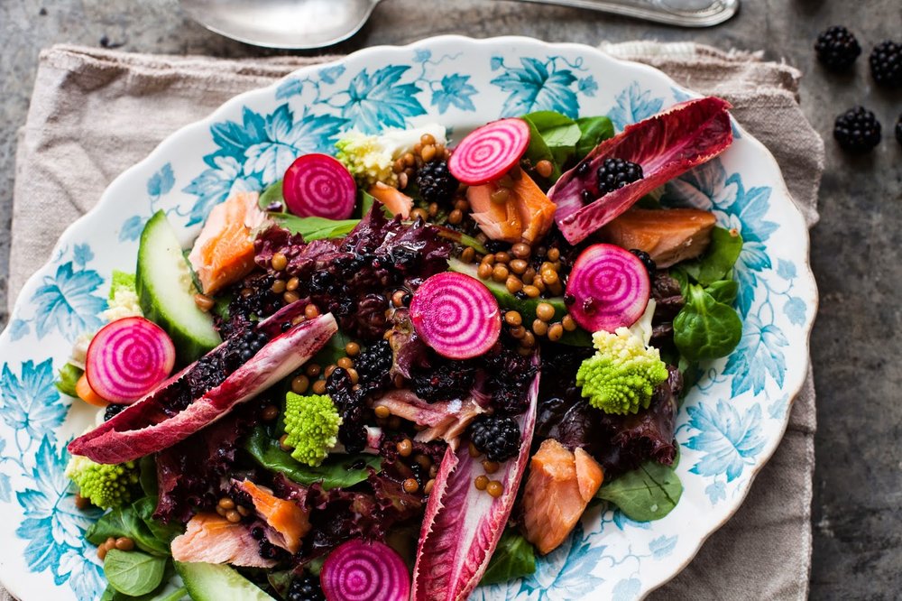 Arrange the salad leaves, endive, cucumber and spring onions on a large plate. Scrub the beetroot well. If the skin is smooth there is no need to peel just thinly slice to show off the lovely stripes and arrange on the plate with the cauliflower florets. Flake the salmon and scatter, together with the lentils, and remaining berries over the salad.