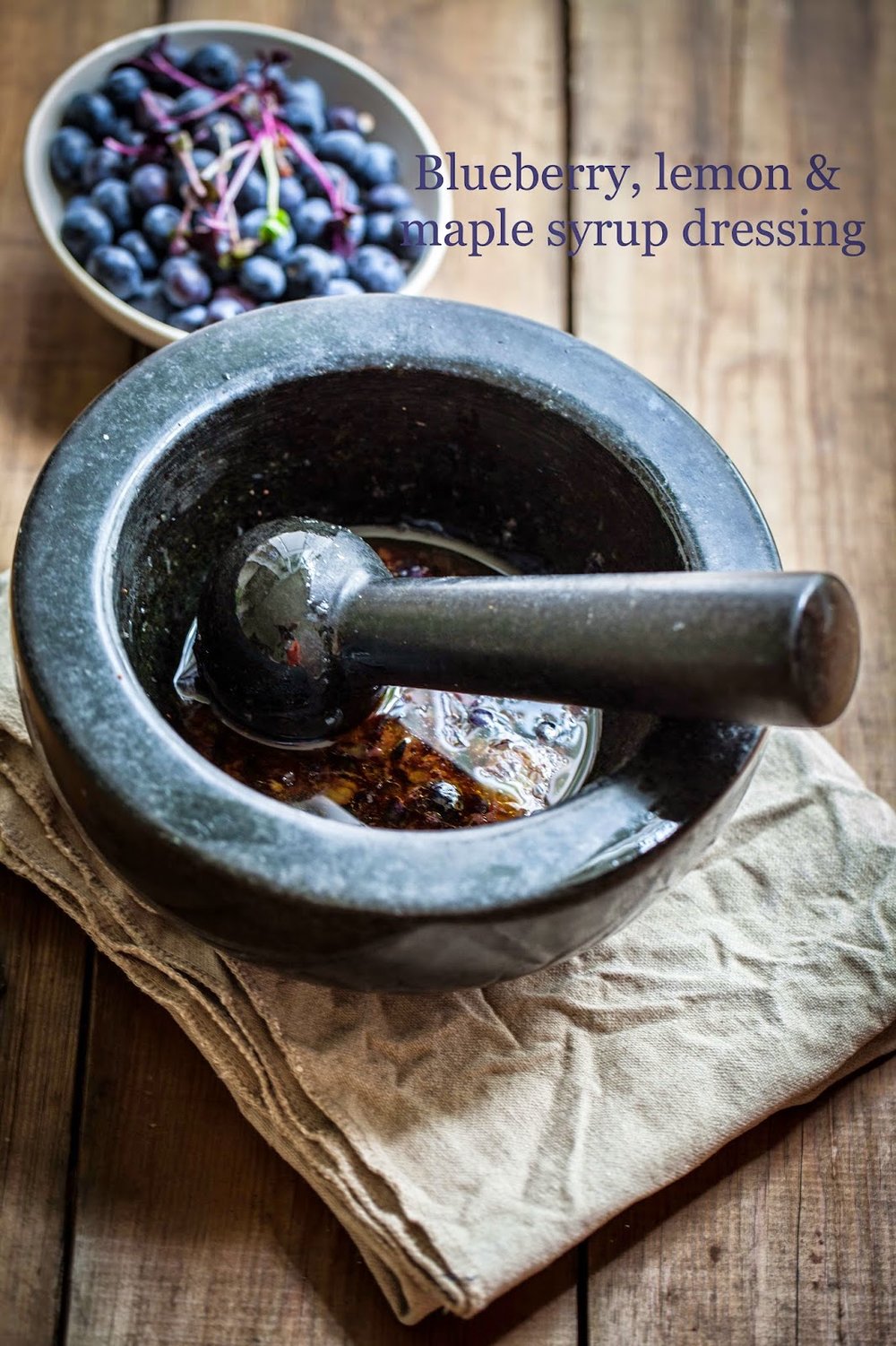 I have always loved the idea of fruity dressings, for example, made with fresh raspberry vinegar but my recipe is a quick solution to this. I got the idea of crushing berries and mixing them with maple syrup, olive oil and seasoning from the September edition of Delicious magazine. It works really well with blackberries and also blueberries as in the photo below.
